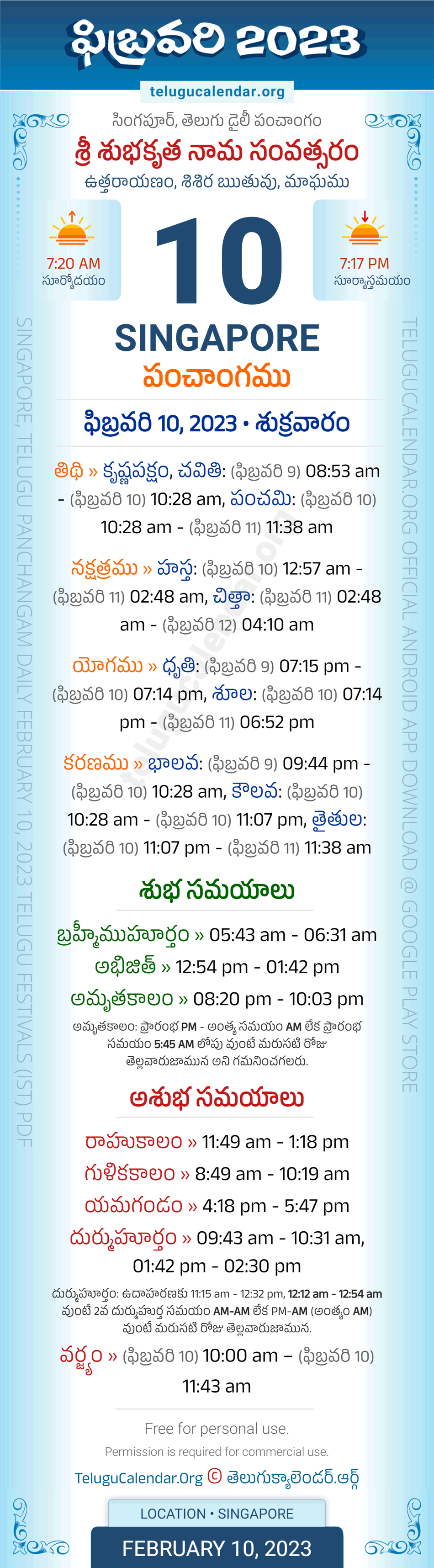Download » February 10, 2023 » Singapore (Singapore) Telugu Panchangam Daily Sheet with Auspicious and Inauspicious Timings.
