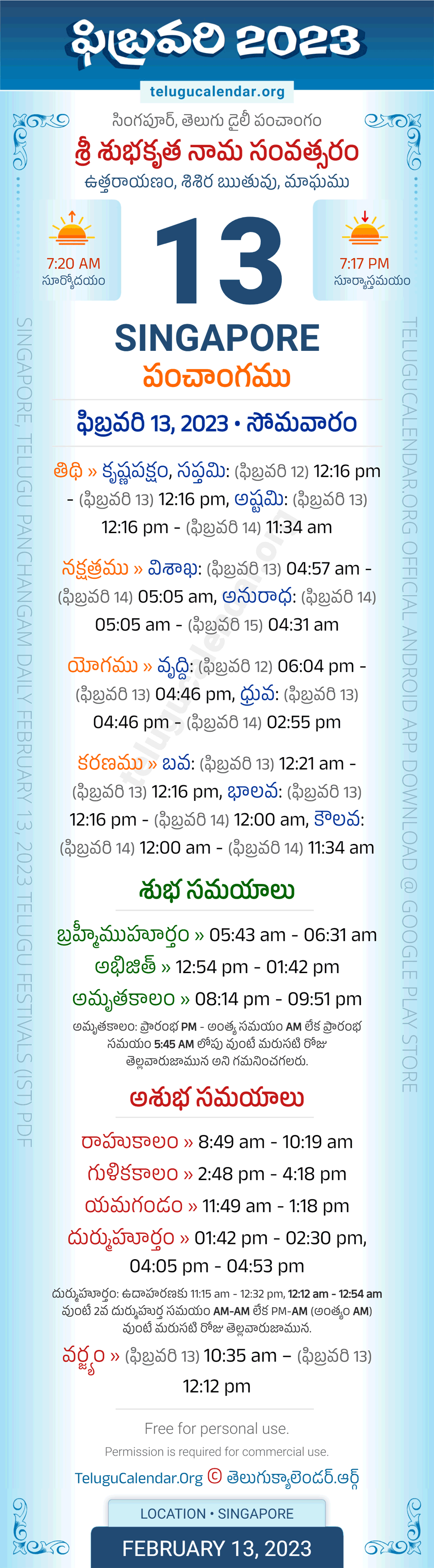 Download » February 13, 2023 » Singapore (Singapore) Telugu Panchangam Daily Sheet with Auspicious and Inauspicious Timings.