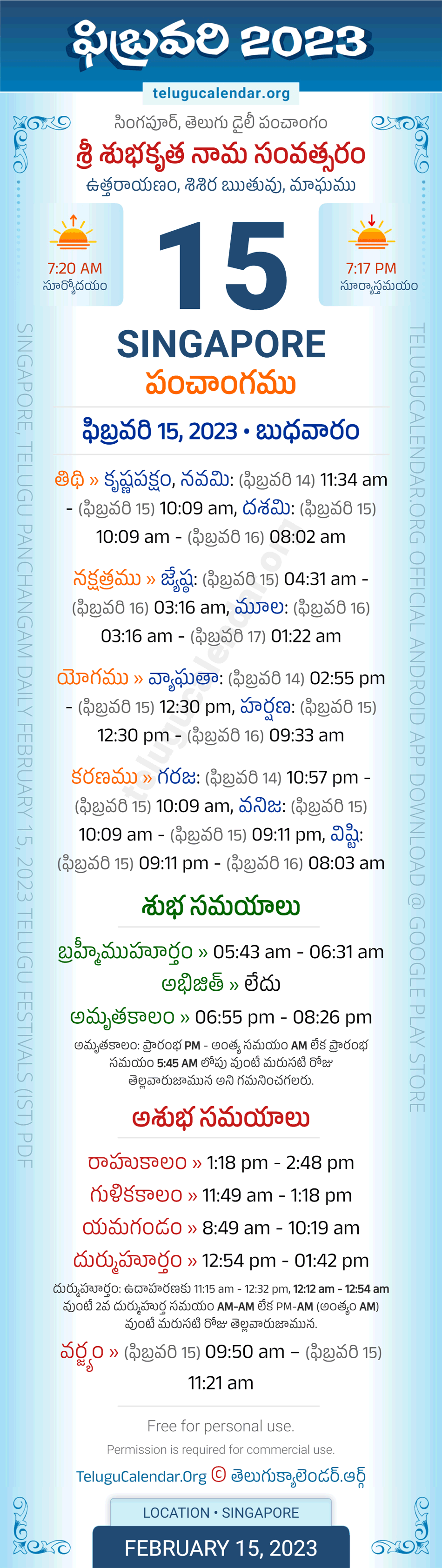 Download » February 15, 2023 » Singapore (Singapore) Telugu Panchangam Daily Sheet with Auspicious and Inauspicious Timings.