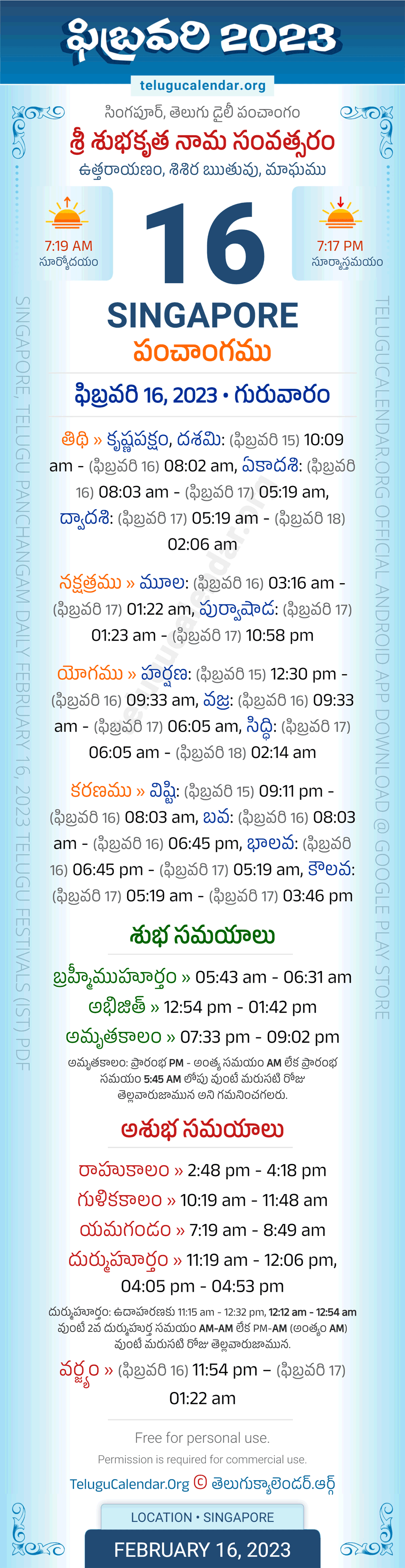Download » February 16, 2023 » Singapore (Singapore) Telugu Panchangam Daily Sheet with Auspicious and Inauspicious Timings.