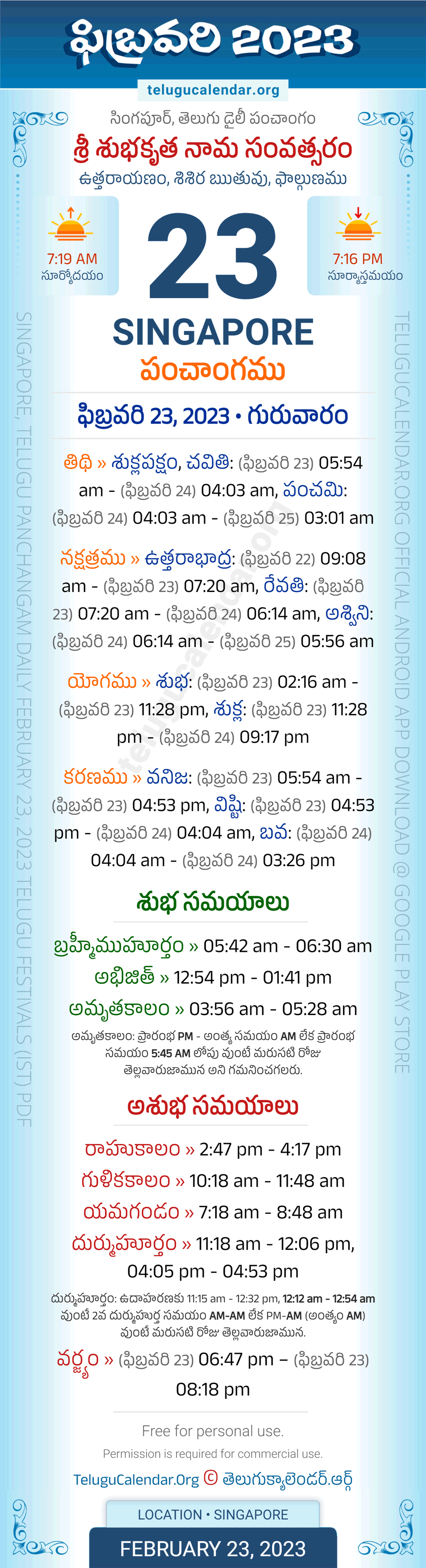 Download » February 23, 2023 » Singapore (Singapore) Telugu Panchangam Daily Sheet with Auspicious and Inauspicious Timings.