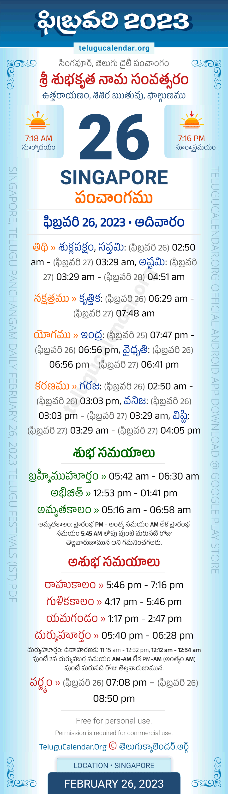 Download » February 26, 2023 » Singapore (Singapore) Telugu Panchangam Daily Sheet with Auspicious and Inauspicious Timings.