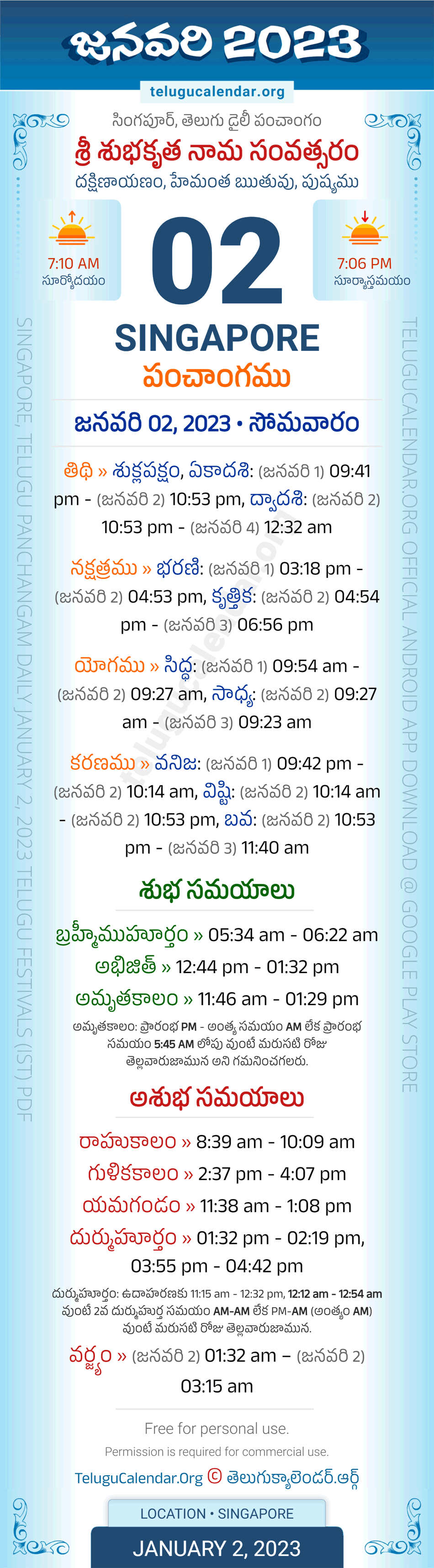 Download » January 2, 2023 » Singapore (Singapore) Telugu Panchangam Daily Sheet with Auspicious and Inauspicious Timings.