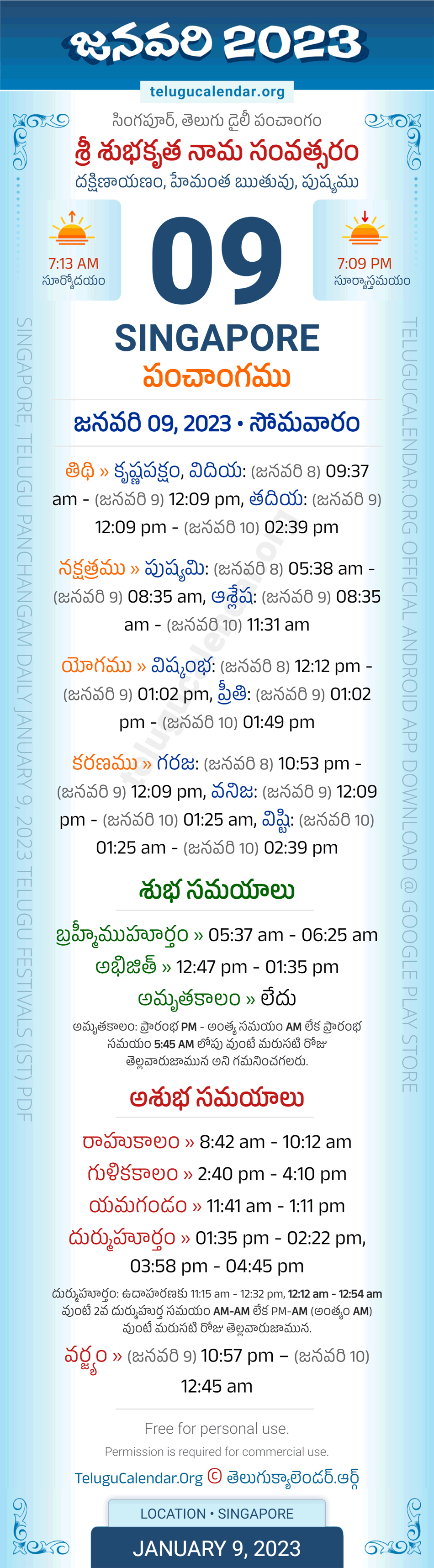 Download » January 9, 2023 » Singapore (Singapore) Telugu Panchangam Daily Sheet with Auspicious and Inauspicious Timings.