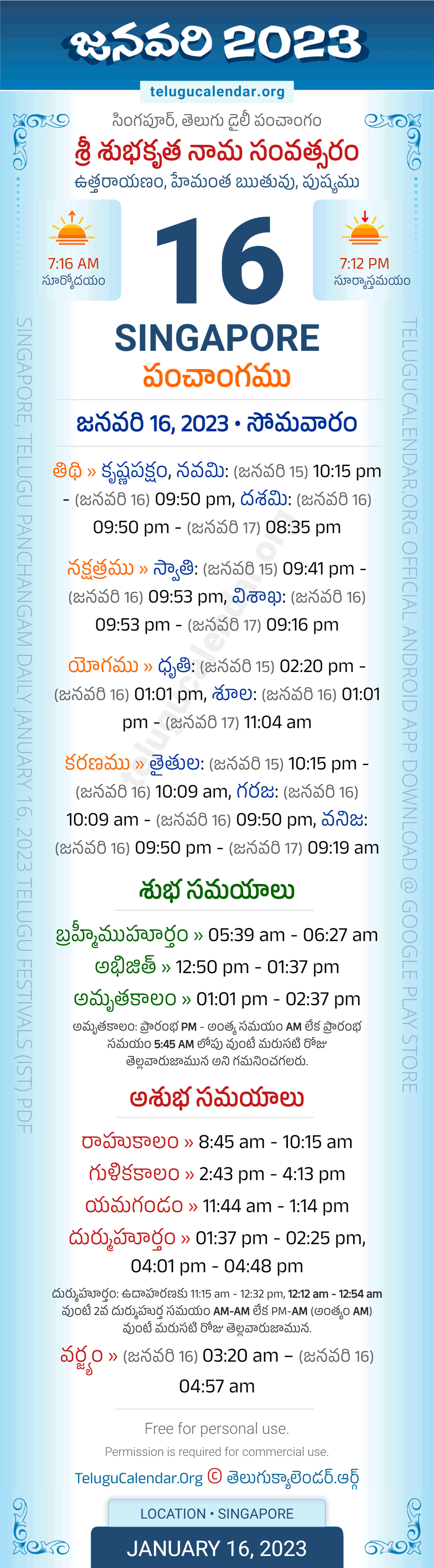 Download » January 16, 2023 » Singapore (Singapore) Telugu Panchangam Daily Sheet with Auspicious and Inauspicious Timings.
