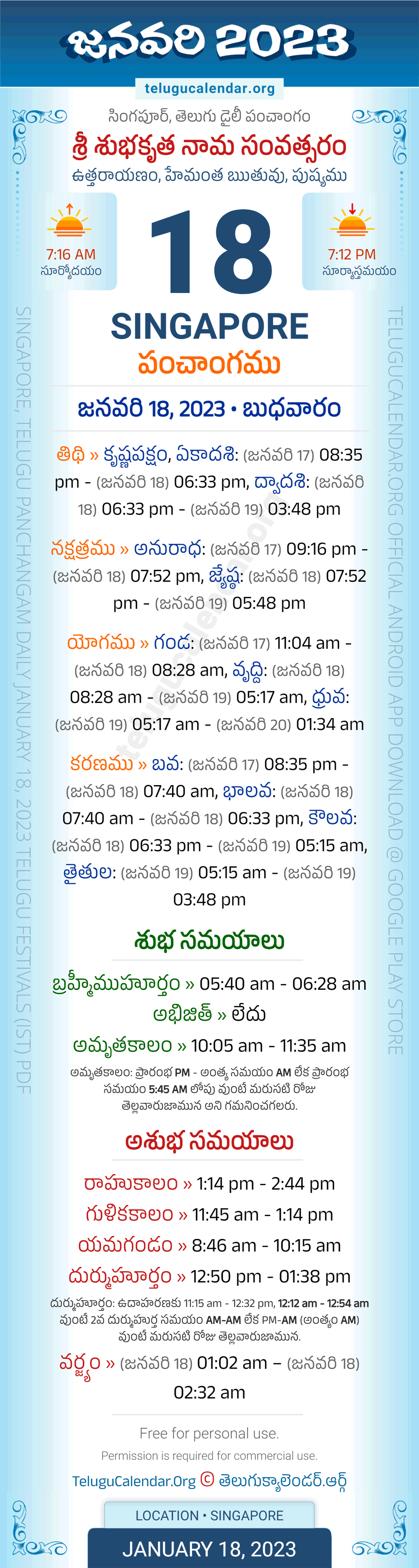 Download » January 18, 2023 » Singapore (Singapore) Telugu Panchangam Daily Sheet with Auspicious and Inauspicious Timings.