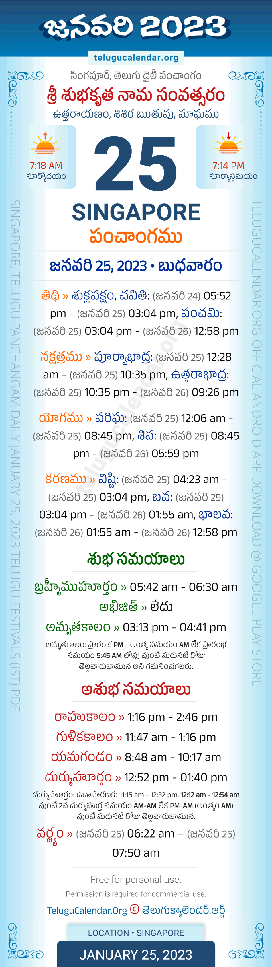Download » January 25, 2023 » Singapore (Singapore) Telugu Panchangam Daily Sheet with Auspicious and Inauspicious Timings.