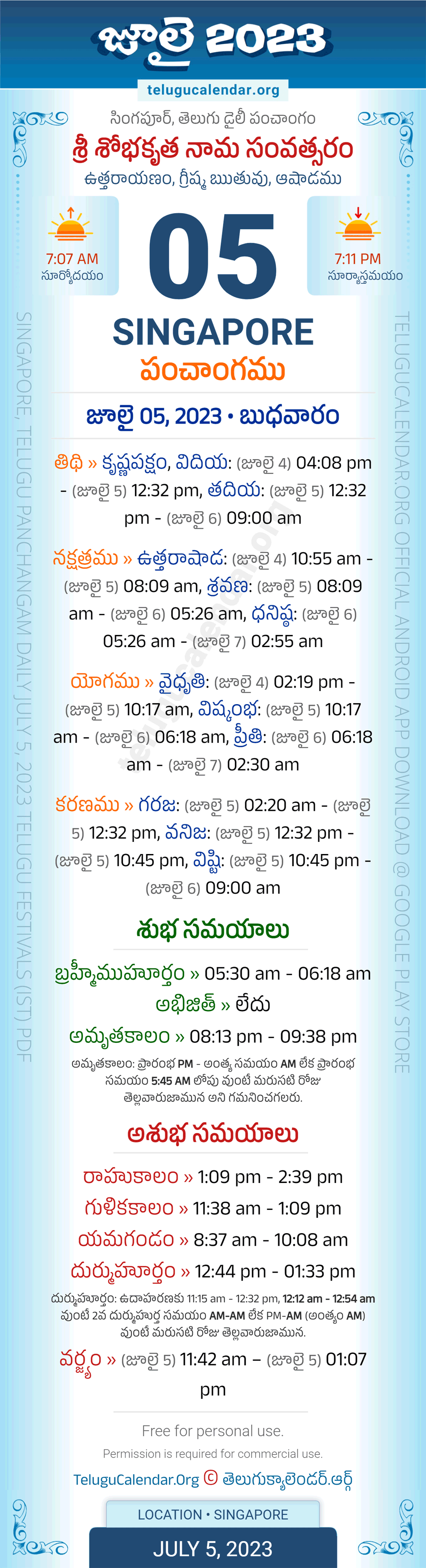 Download » July 5, 2023 » Singapore (Singapore) Telugu Panchangam Daily Sheet with Auspicious and Inauspicious Timings.