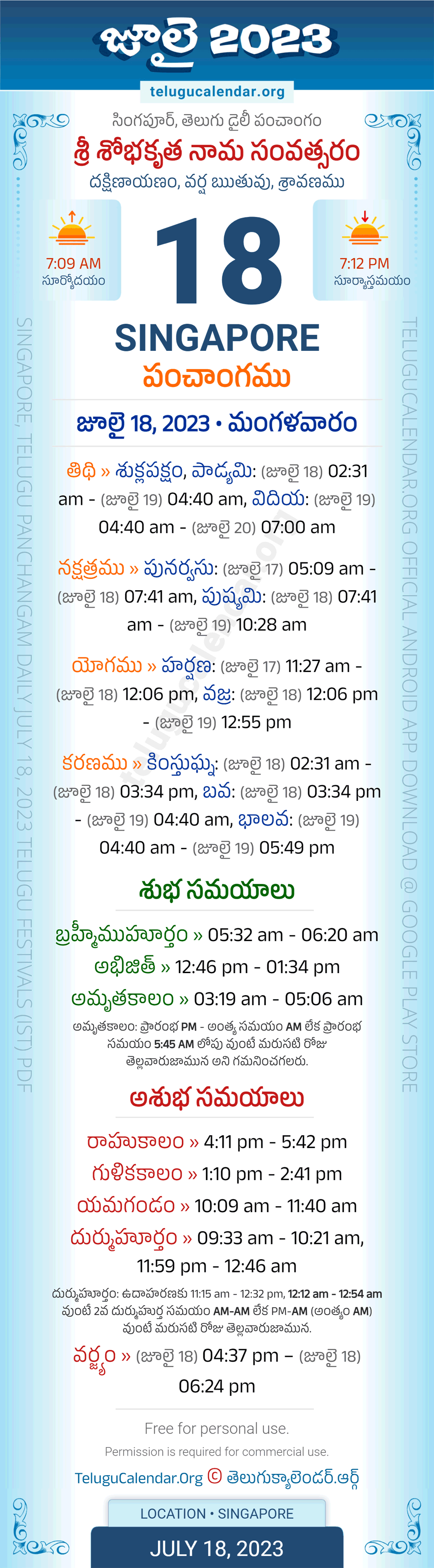 Download » July 18, 2023 » Singapore (Singapore) Telugu Panchangam Daily Sheet with Auspicious and Inauspicious Timings.