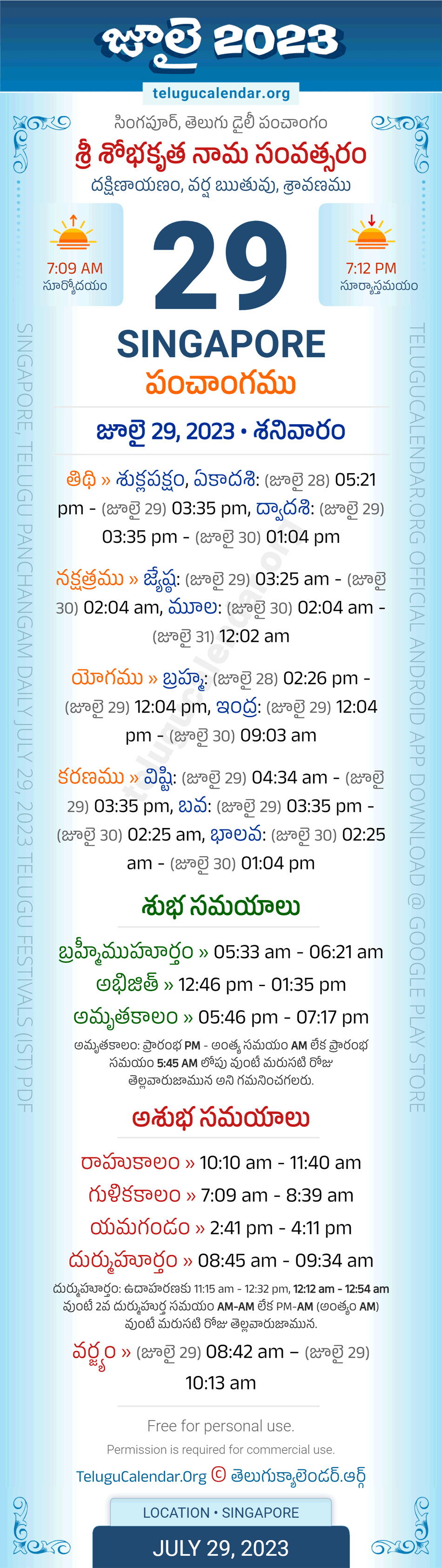 Download » July 29, 2023 » Singapore (Singapore) Telugu Panchangam Daily Sheet with Auspicious and Inauspicious Timings.