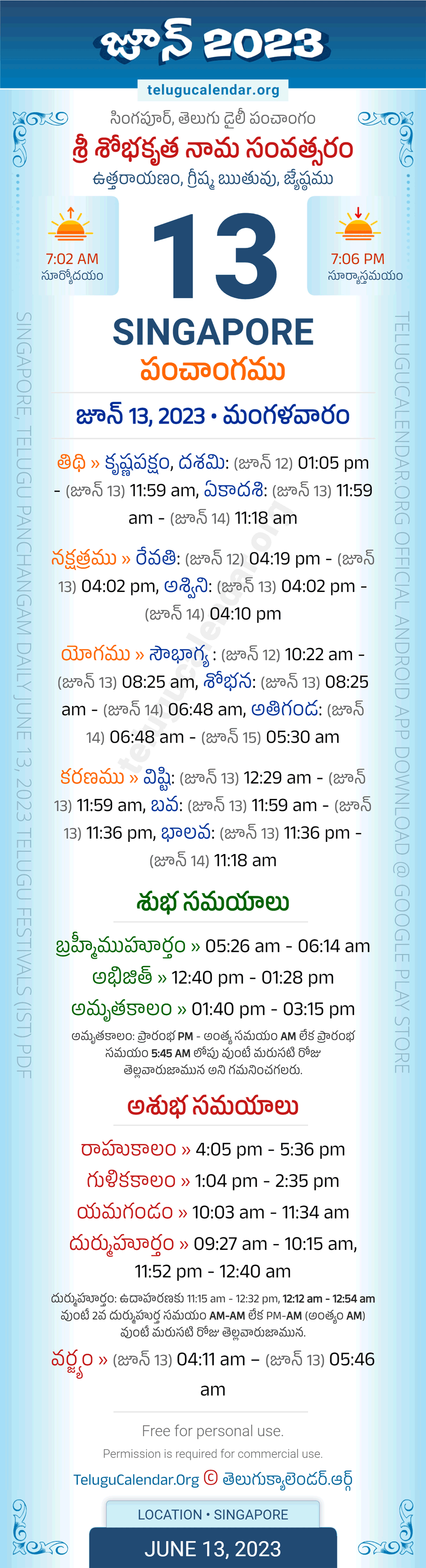 Download » June 13, 2023 » Singapore (Singapore) Telugu Panchangam Daily Sheet with Auspicious and Inauspicious Timings.