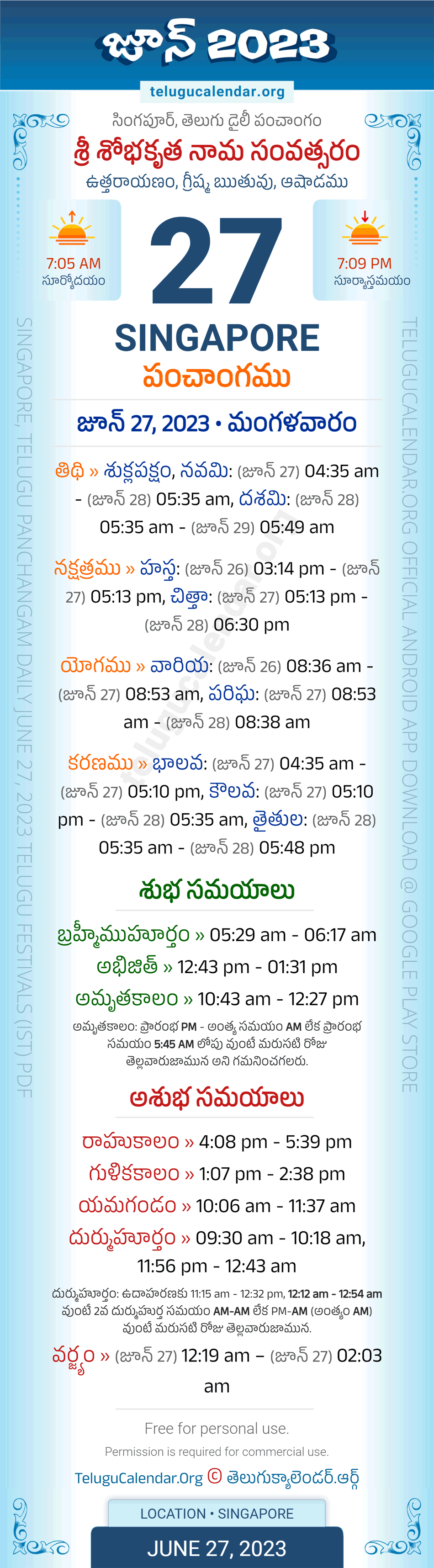 Download » June 27, 2023 » Singapore (Singapore) Telugu Panchangam Daily Sheet with Auspicious and Inauspicious Timings.