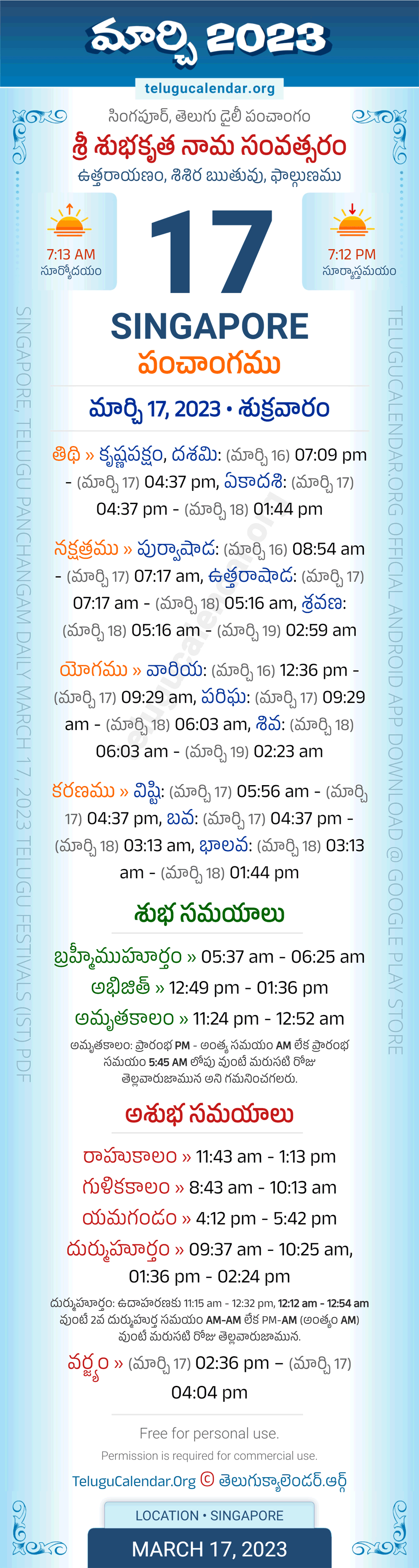 Download » March 17, 2023 » Singapore (Singapore) Telugu Panchangam Daily Sheet with Auspicious and Inauspicious Timings.