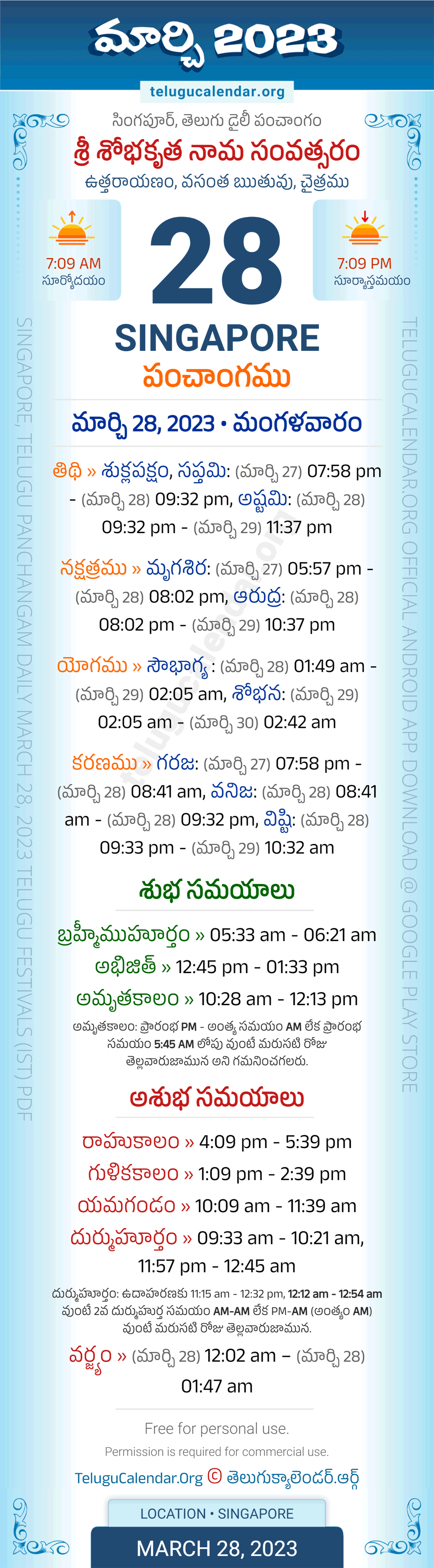Download » March 28, 2023 » Singapore (Singapore) Telugu Panchangam Daily Sheet with Auspicious and Inauspicious Timings.