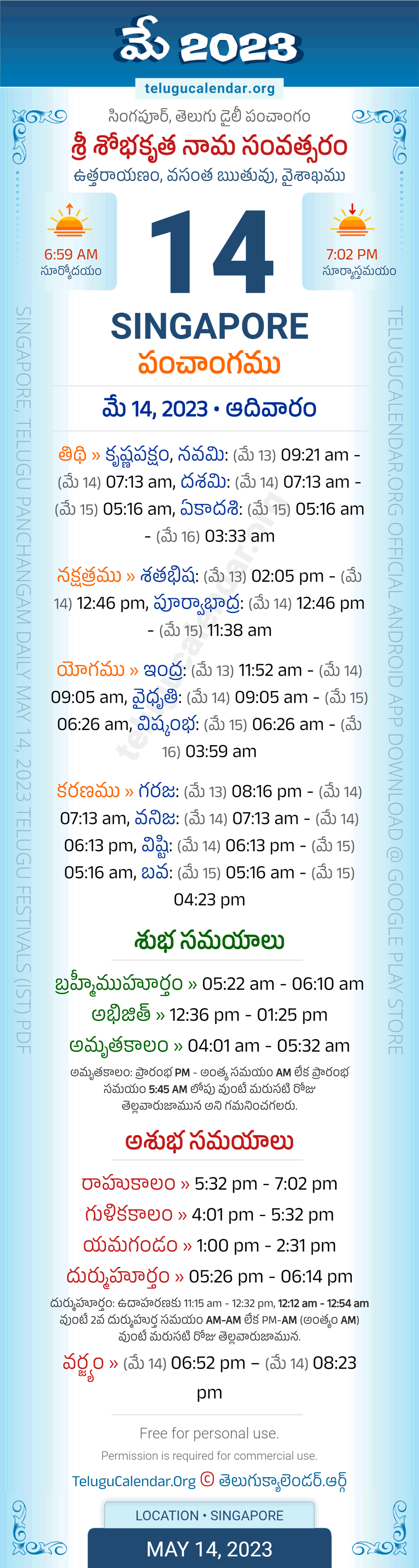Download » May 14, 2023 » Singapore (Singapore) Telugu Panchangam Daily Sheet with Auspicious and Inauspicious Timings.