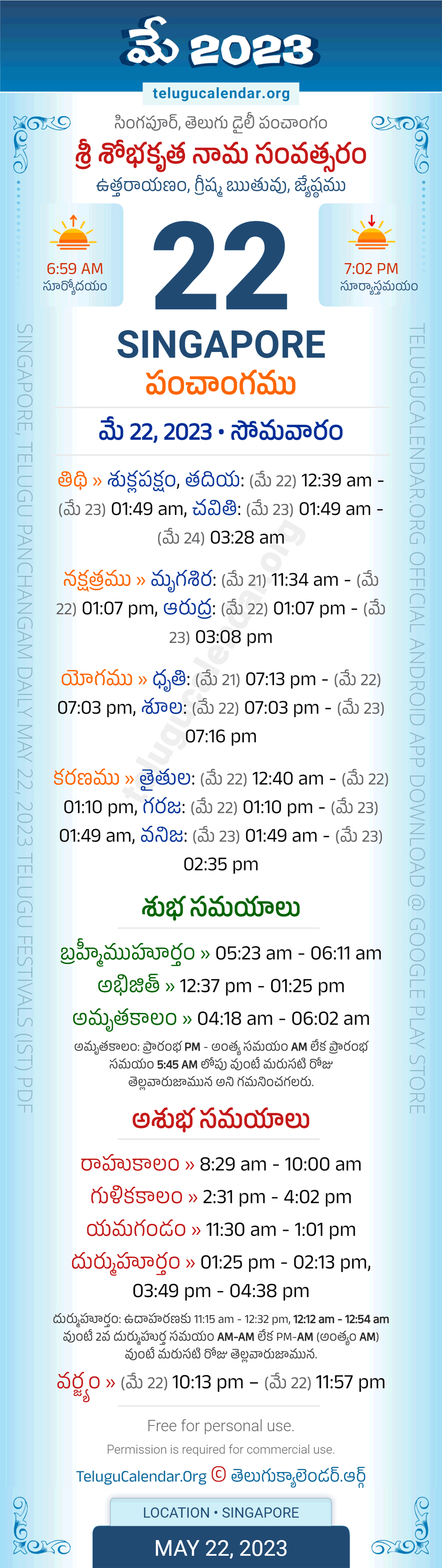Download » May 22, 2023 » Singapore (Singapore) Telugu Panchangam Daily Sheet with Auspicious and Inauspicious Timings.