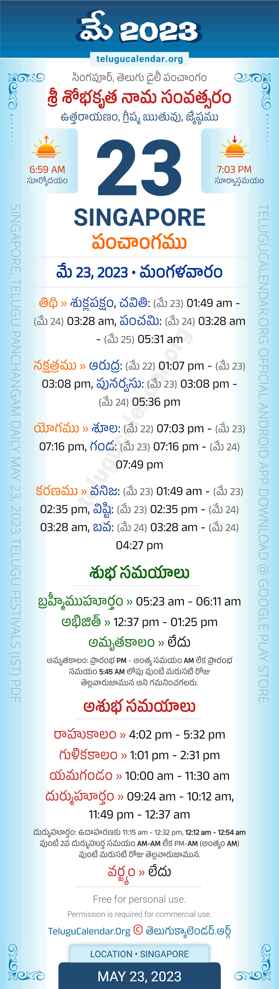 Download » May 23, 2023 » Singapore (Singapore) Telugu Panchangam Daily Sheet with Auspicious and Inauspicious Timings.