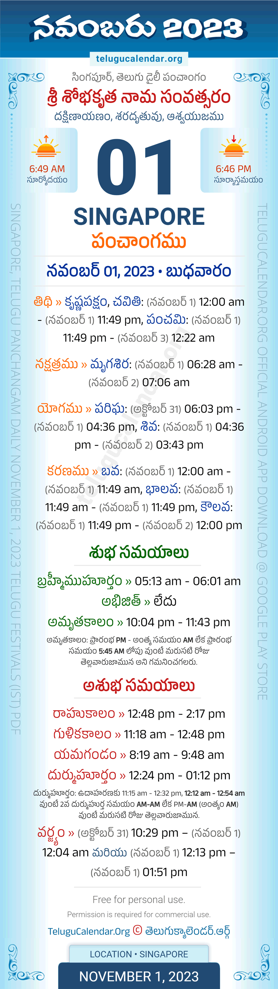 Download » November 1, 2023 » Singapore (Singapore) Telugu Panchangam Daily Sheet with Auspicious and Inauspicious Timings.