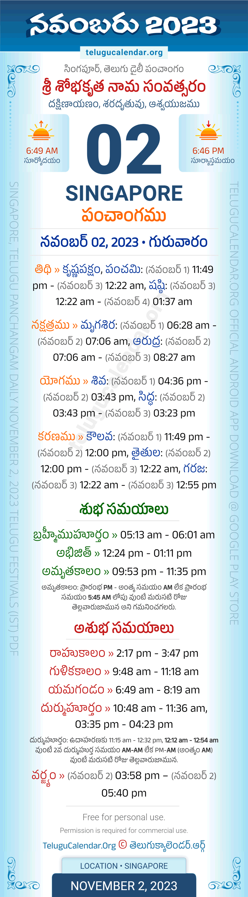 Singapore Panchangam November 2, 2023 Daily Sheet in Telugu... Singapore Telugu Panchangam Thursday, November 02, 2023, Today's Singapore Tithi: Krishna Paksham, Panchami: (Nov 1) 11:49 pm - (Nov 3) 12:22 am, Shashthi: (Nov 3) 12:22 am - (Nov 4) 01:37 am, Today's Singapore Nakshatram: Mrigasira: (Nov 1) 06:28 am - (Nov 2) 07:06 am, Arudra: (Nov 2) 07:06 am - (Nov 3) 08:27 am, Telugu Year: Sri Sobhakritu Nama Samvatsaram, Vedic Aayana: Dakshinayanam, Vedic Rutuvu: Sharad, Chandramasa (Amanta): Ashwayujamu. Below image showing information about the 5 attributes of the day, viz., Varam, Tithi, Nakshatram, Yogam & Karanam along with starting and end timings. Read more