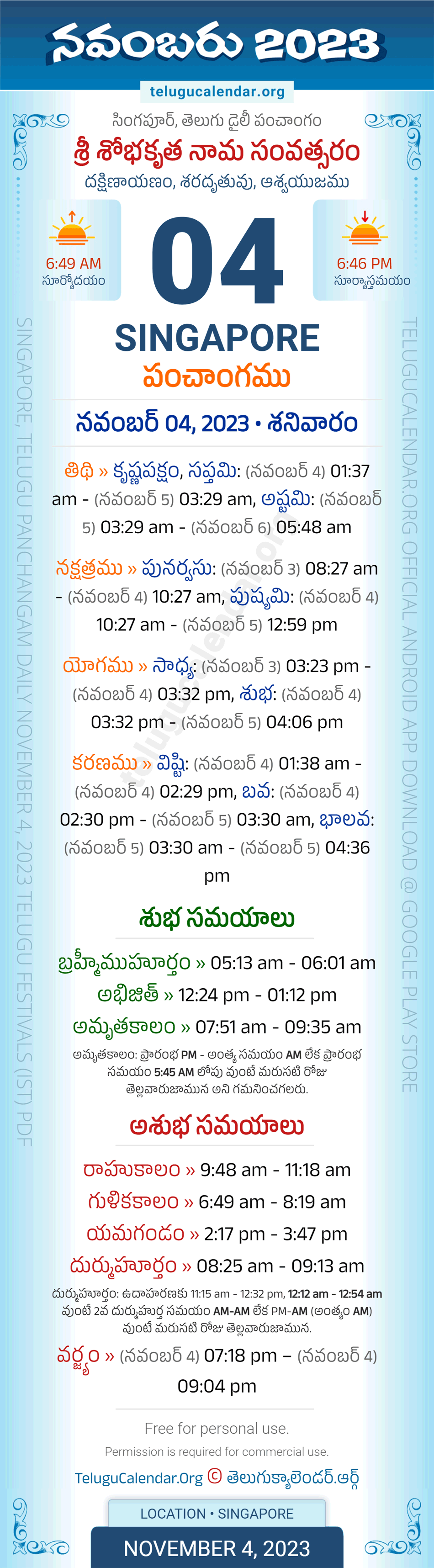 Download » November 4, 2023 » Singapore (Singapore) Telugu Panchangam Daily Sheet with Auspicious and Inauspicious Timings.