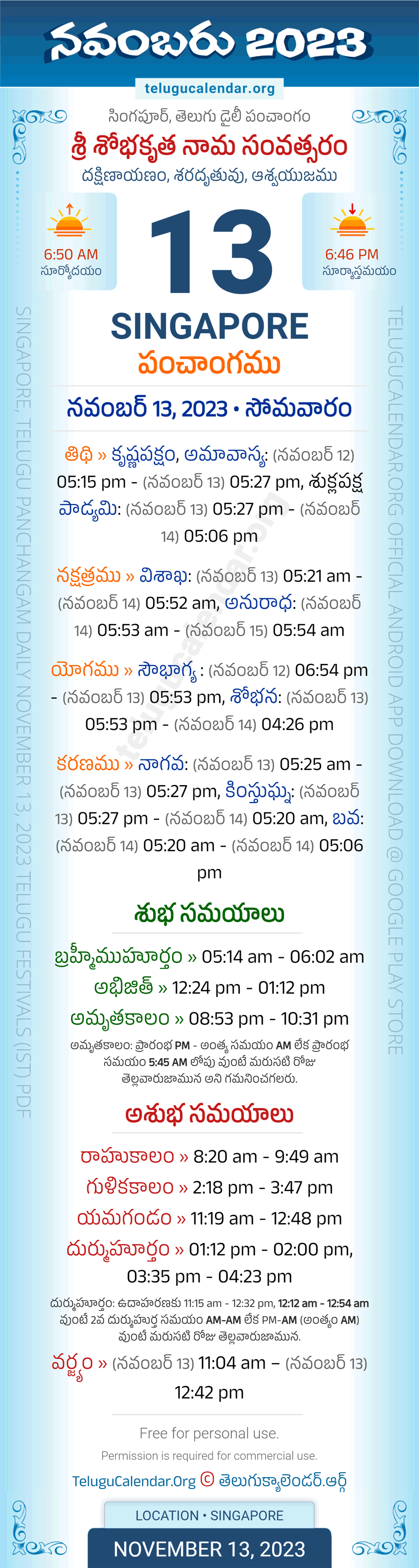 Download » November 13, 2023 » Singapore (Singapore) Telugu Panchangam Daily Sheet with Auspicious and Inauspicious Timings.