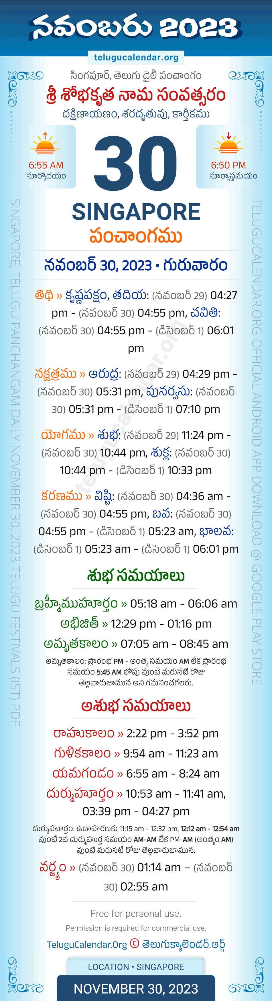 Download » November 30, 2023 » Singapore (Singapore) Telugu Panchangam Daily Sheet with Auspicious and Inauspicious Timings.
