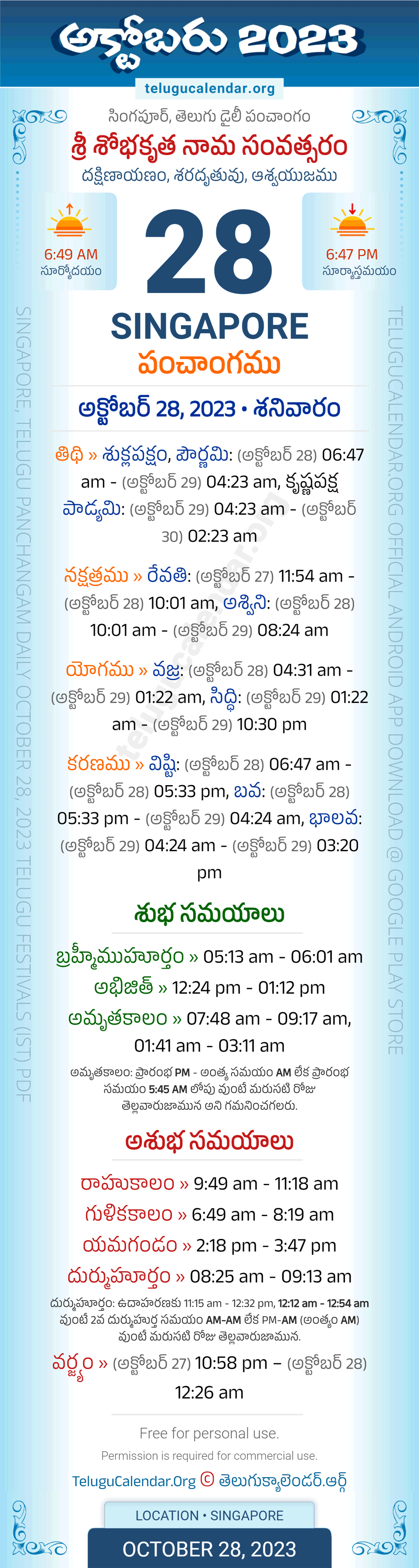 Singapore Panchangam October 28, 2023 Daily Sheet in Telugu... Singapore Telugu Panchangam Saturday, October 28, 2023, Today's Singapore Tithi: Sukla Paksham, Pournami: (Oct 28) 06:47 am - (Oct 29) 04:23 am, Krishna Paksha Padyami: (Oct 29) 04:23 am - (Oct 30) 02:23 am, Today's Singapore Nakshatram: Revathi: (Oct 27) 11:54 am - (Oct 28) 10:01 am, Aswini: (Oct 28) 10:01 am - (Oct 29) 08:24 am, Telugu Year: Sri Sobhakritu Nama Samvatsaram, Vedic Aayana: Dakshinayanam, Vedic Rutuvu: Sharad, Chandramasa (Amanta): Ashwayujamu. Below image showing information about the 5 attributes of the day, viz., Varam, Tithi, Nakshatram, Yogam & Karanam along with starting and end timings. Read more