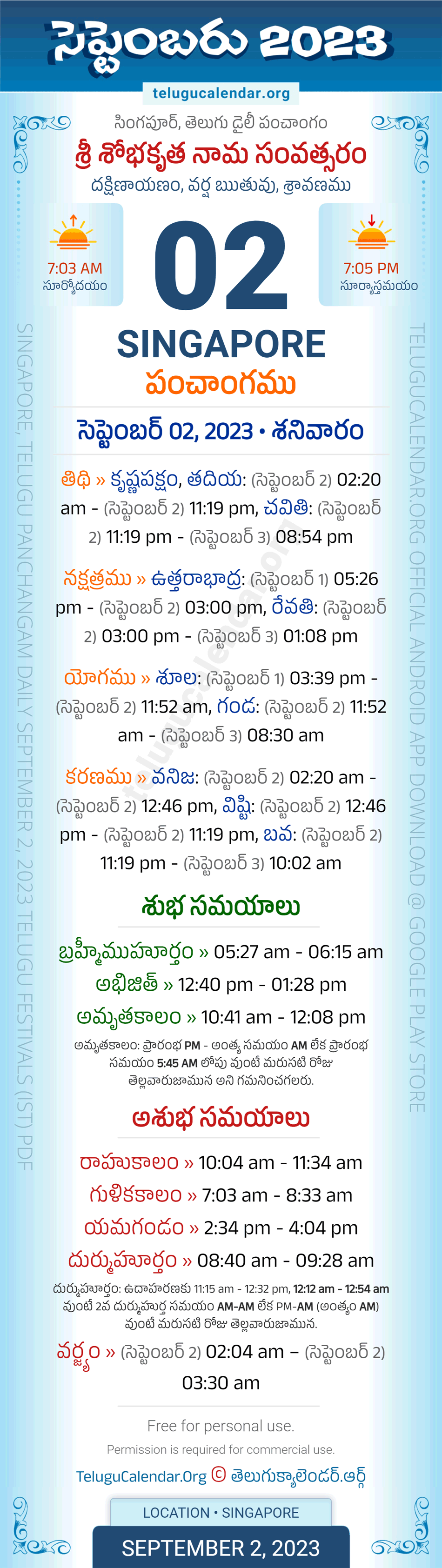 Download » September 2, 2023 » Singapore (Singapore) Telugu Panchangam Daily Sheet with Auspicious and Inauspicious Timings.