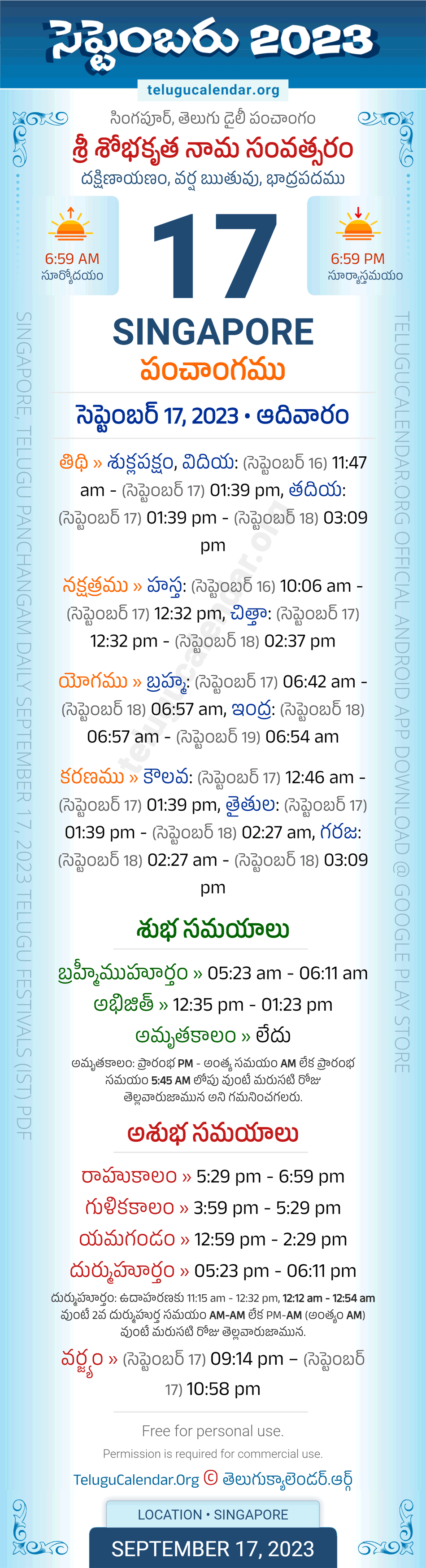 Download » September 17, 2023 » Singapore (Singapore) Telugu Panchangam Daily Sheet with Auspicious and Inauspicious Timings.