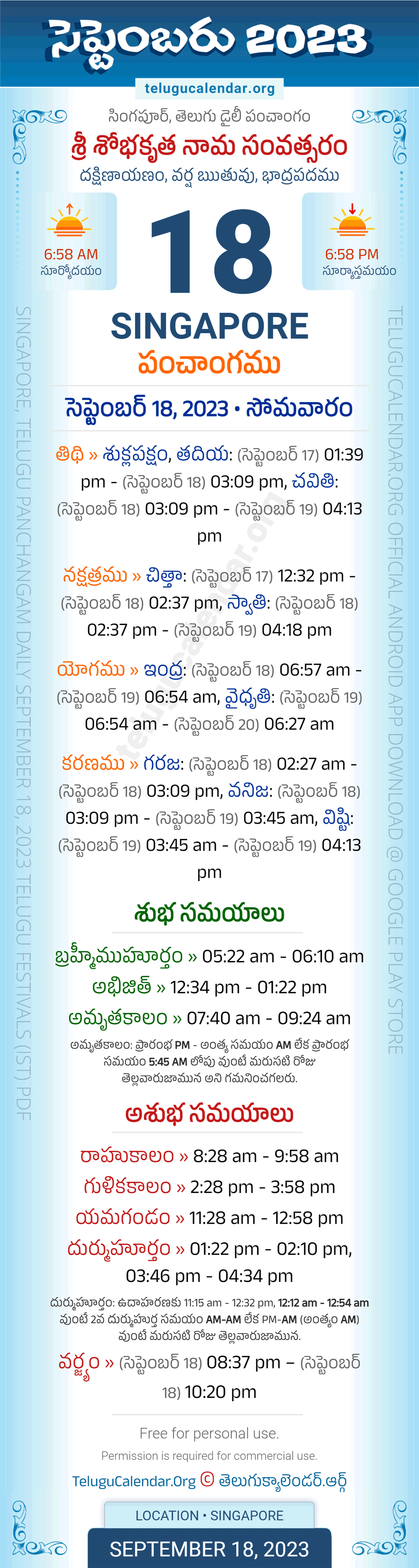 Download » September 18, 2023 » Singapore (Singapore) Telugu Panchangam Daily Sheet with Auspicious and Inauspicious Timings.