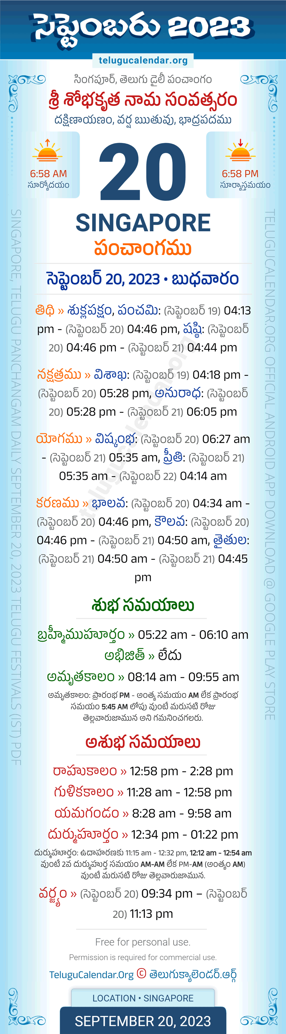 Download » September 20, 2023 » Singapore (Singapore) Telugu Panchangam Daily Sheet with Auspicious and Inauspicious Timings.