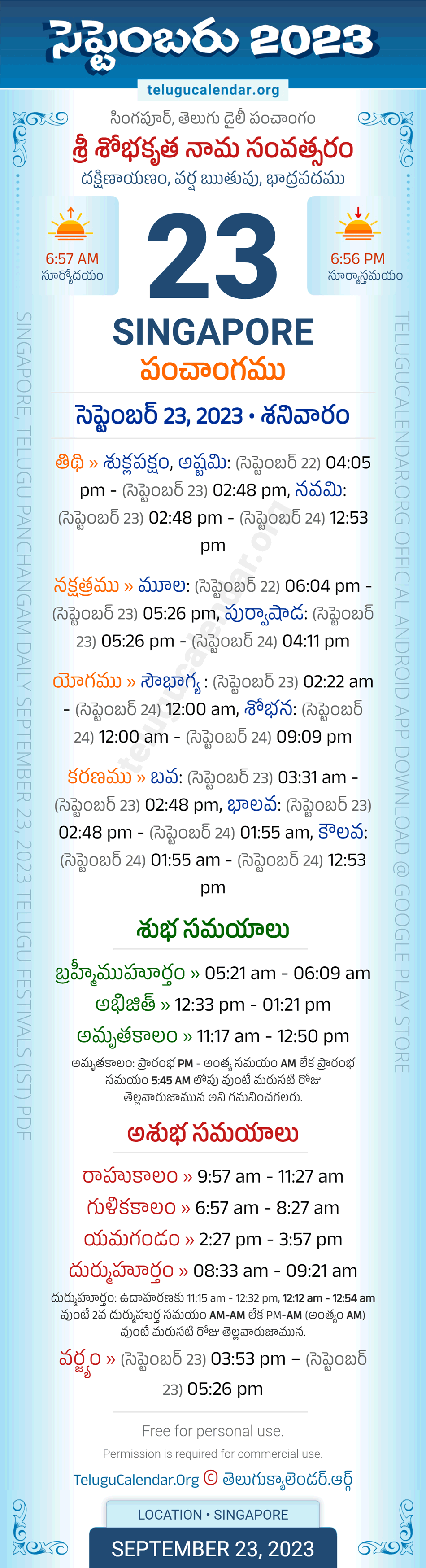 Singapore Panchangam September 23, 2023 Daily Sheet in Telugu... Singapore Telugu Panchangam Saturday, September 23, 2023, Today's Singapore Tithi: Sukla Paksham, Ashtami: (Sep 22) 04:05 pm - (Sep 23) 02:48 pm, Navami: (Sep 23) 02:48 pm - (Sep 24) 12:53 pm, Today's Singapore Nakshatram: Moola: (Sep 22) 06:04 pm - (Sep 23) 05:26 pm, Purva Ashadha: (Sep 23) 05:26 pm - (Sep 24) 04:11 pm, Telugu Year: Sri Sobhakritu Nama Samvatsaram, Vedic Aayana: Dakshinayanam, Vedic Rutuvu: Varsha, Chandramasa (Amanta): Bhadrapadamu. Below image showing information about the 5 attributes of the day, viz., Varam, Tithi, Nakshatram, Yogam & Karanam along with starting and end timings. Read more