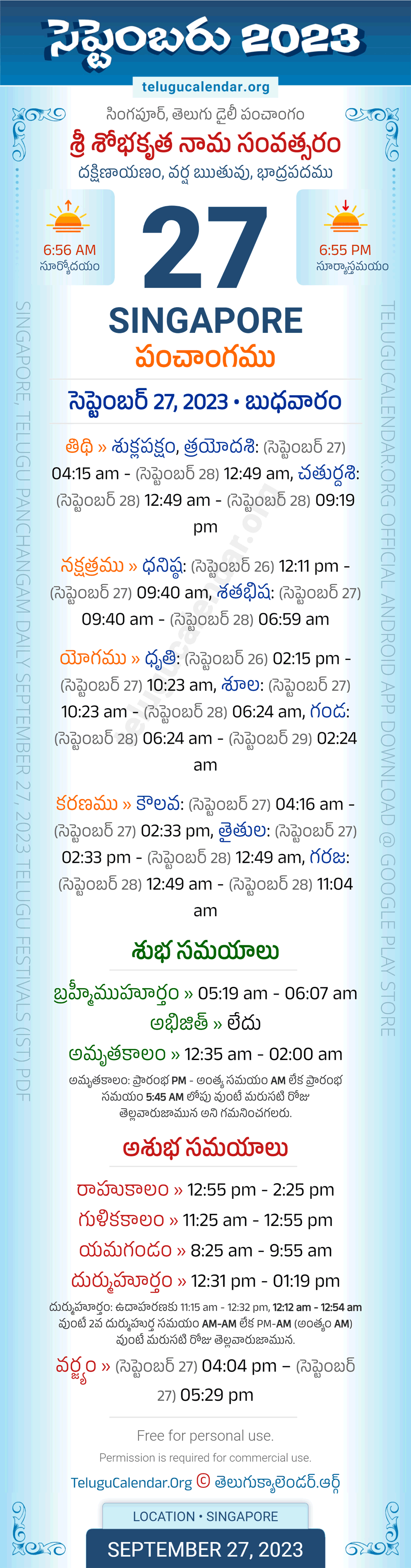 Download » September 27, 2023 » Singapore (Singapore) Telugu Panchangam Daily Sheet with Auspicious and Inauspicious Timings.