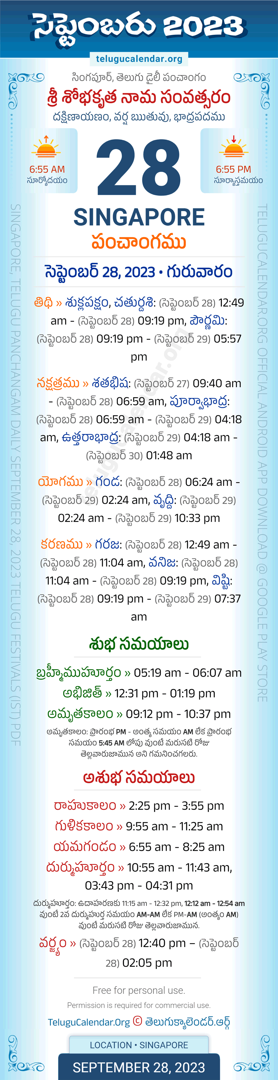 Download » September 28, 2023 » Singapore (Singapore) Telugu Panchangam Daily Sheet with Auspicious and Inauspicious Timings.