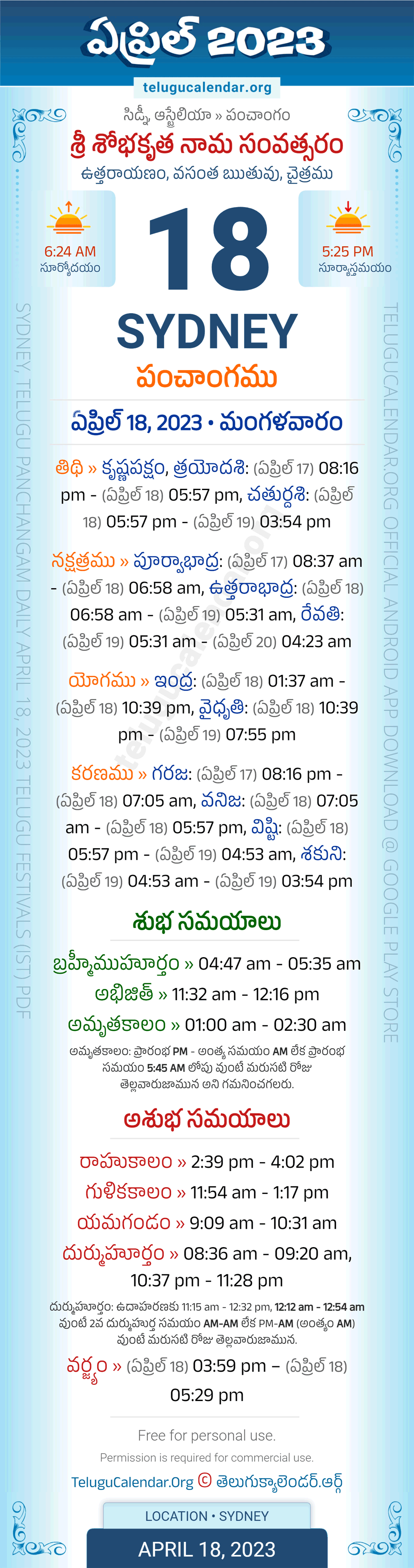 Download » April 18, 2023 » Sydney (Australia) Telugu Panchangam Daily Sheet with Auspicious and Inauspicious Timings.