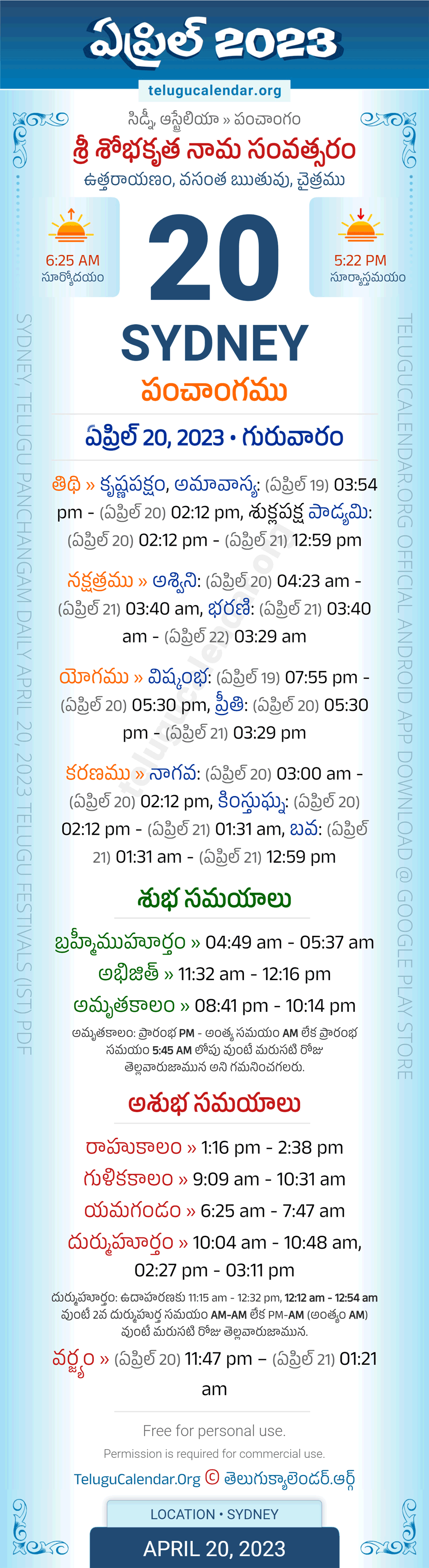 Download » April 20, 2023 » Sydney (Australia) Telugu Panchangam Daily Sheet with Auspicious and Inauspicious Timings.