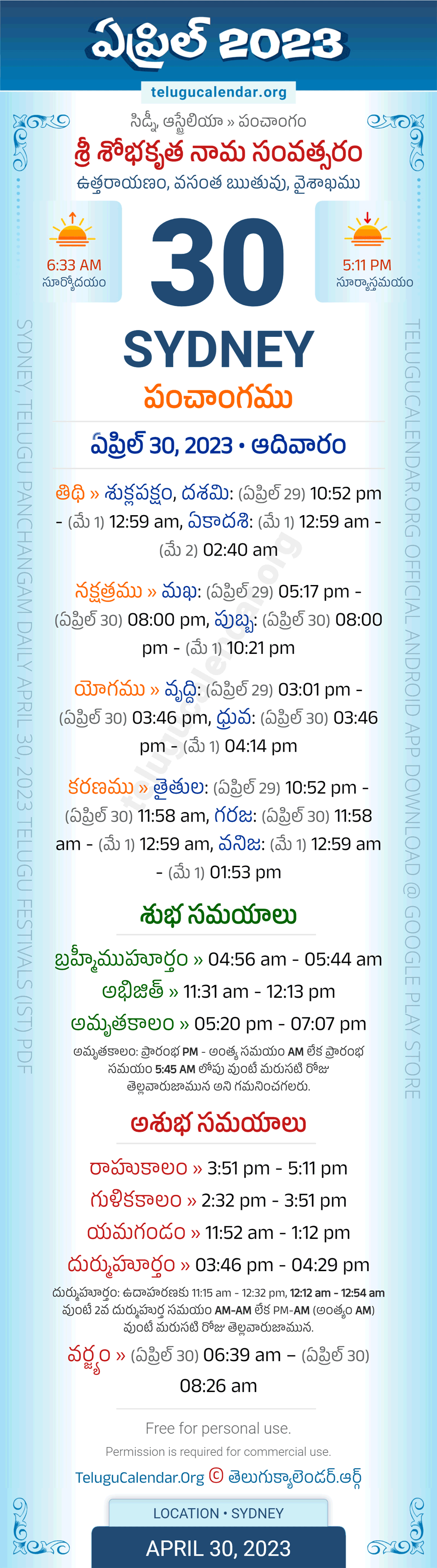 Download » April 30, 2023 » Sydney (Australia) Telugu Panchangam Daily Sheet with Auspicious and Inauspicious Timings.
