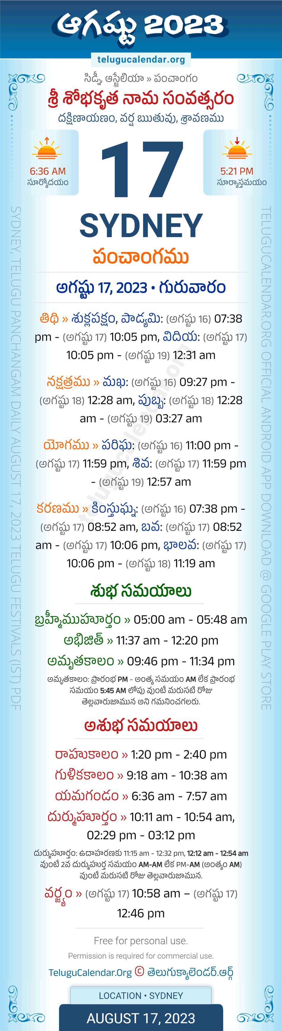 Download » August 17, 2023 » Sydney (Australia) Telugu Panchangam Daily Sheet with Auspicious and Inauspicious Timings.
