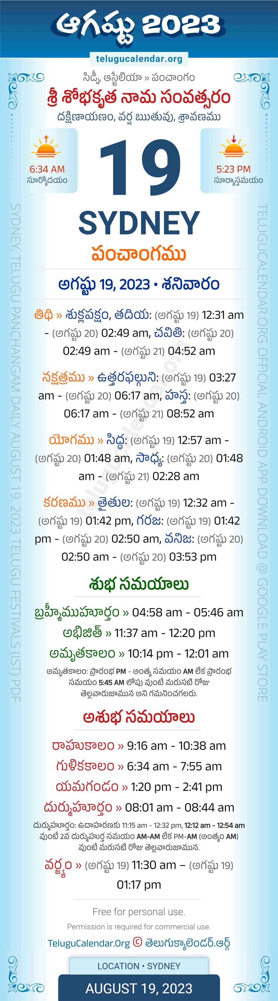 Download » August 19, 2023 » Sydney (Australia) Telugu Panchangam Daily Sheet with Auspicious and Inauspicious Timings.