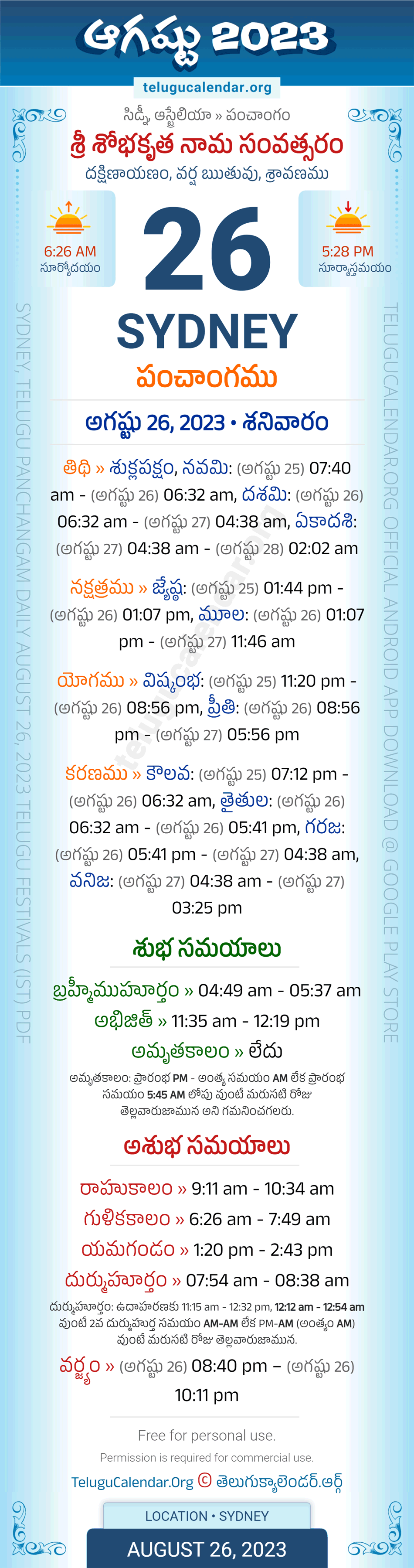 Download » August 26, 2023 » Sydney (Australia) Telugu Panchangam Daily Sheet with Auspicious and Inauspicious Timings.