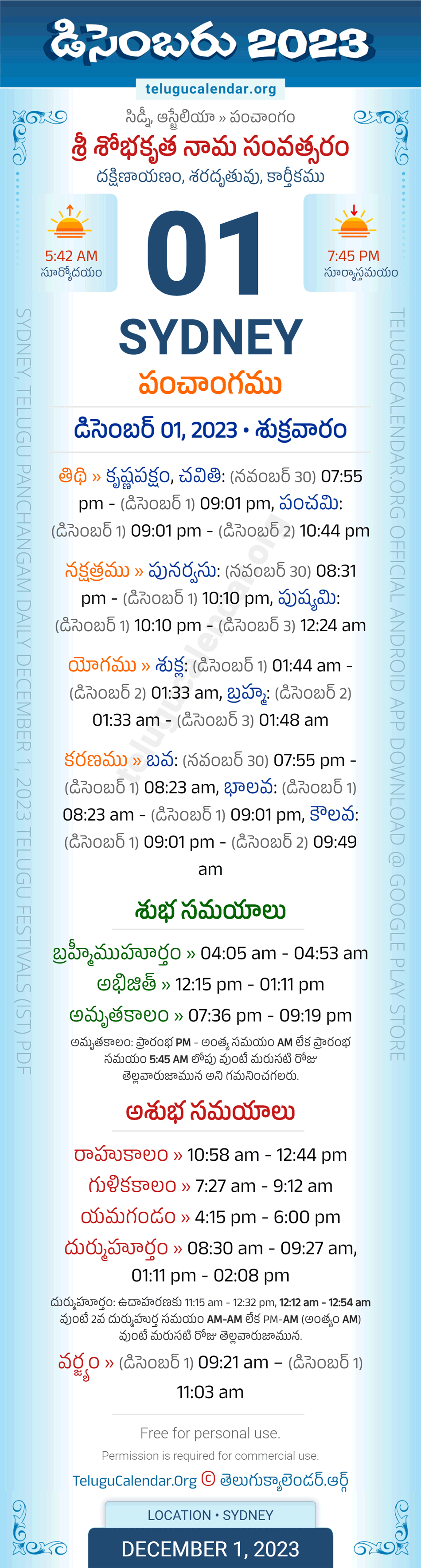 Download » December 1, 2023 » Sydney (Australia) Telugu Panchangam Daily Sheet with Auspicious and Inauspicious Timings.
