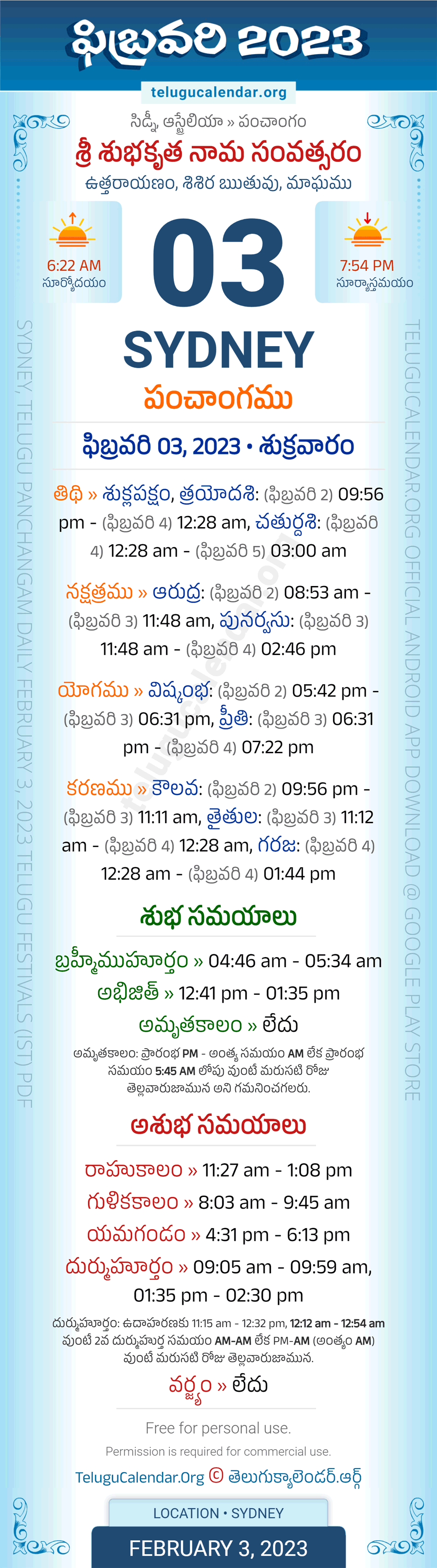 Download » February 3, 2023 » Sydney (Australia) Telugu Panchangam Daily Sheet with Auspicious and Inauspicious Timings.