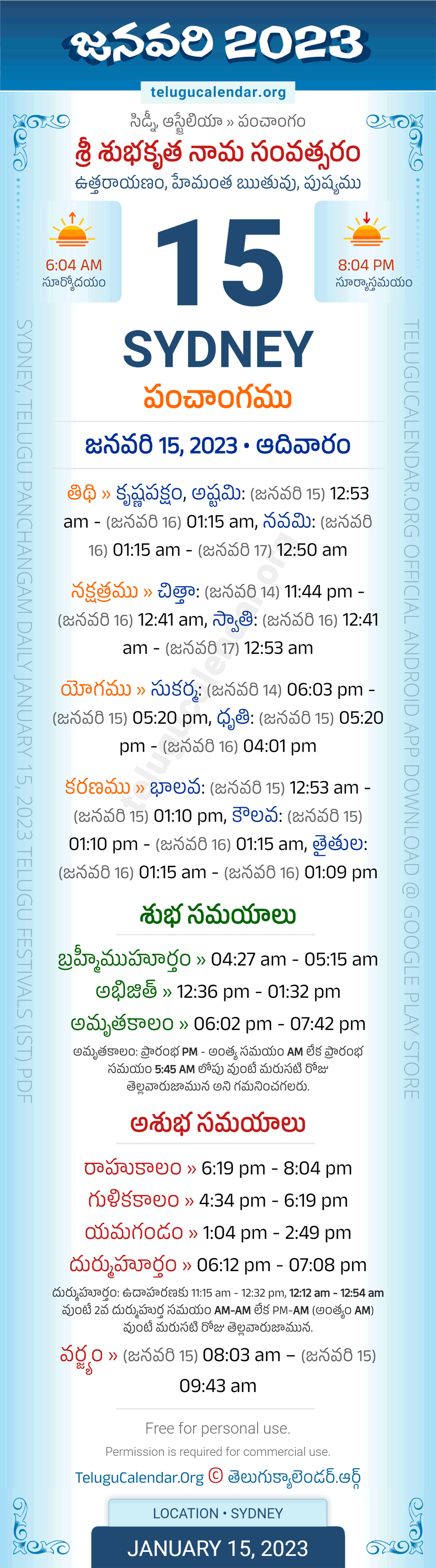 Download » January 15, 2023 » Sydney (Australia) Telugu Panchangam Daily Sheet with Auspicious and Inauspicious Timings.