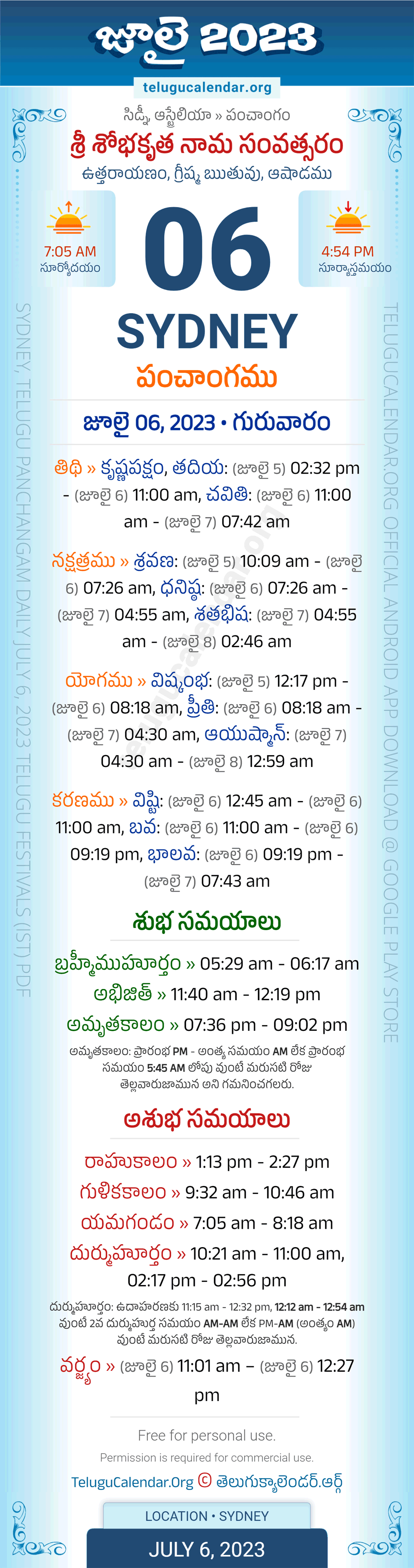 Download » July 6, 2023 » Sydney (Australia) Telugu Panchangam Daily Sheet with Auspicious and Inauspicious Timings.
