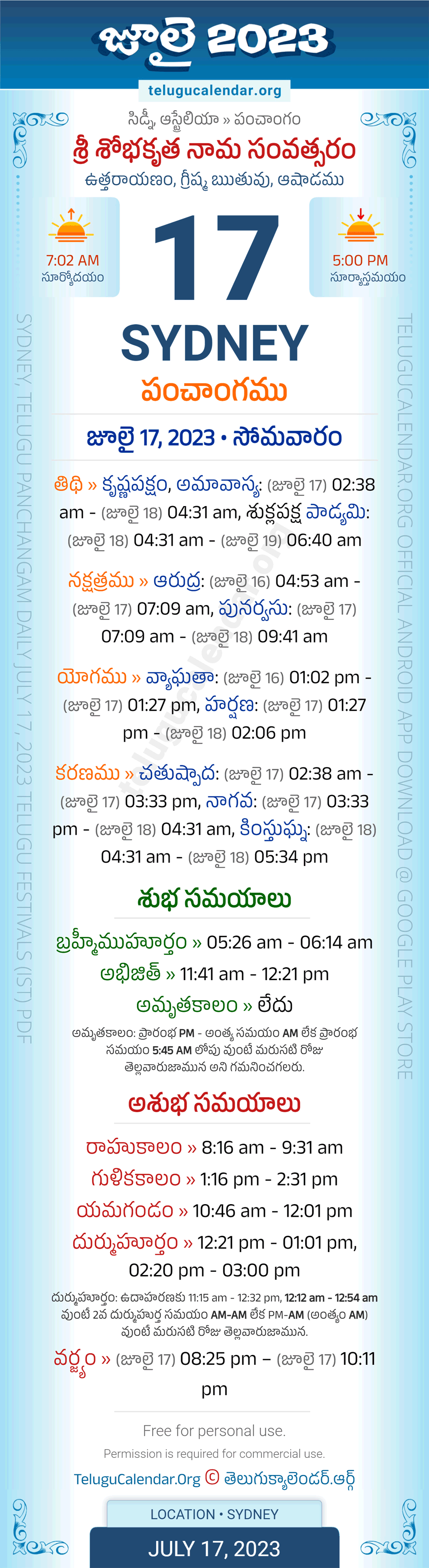 Download » July 17, 2023 » Sydney (Australia) Telugu Panchangam Daily Sheet with Auspicious and Inauspicious Timings.