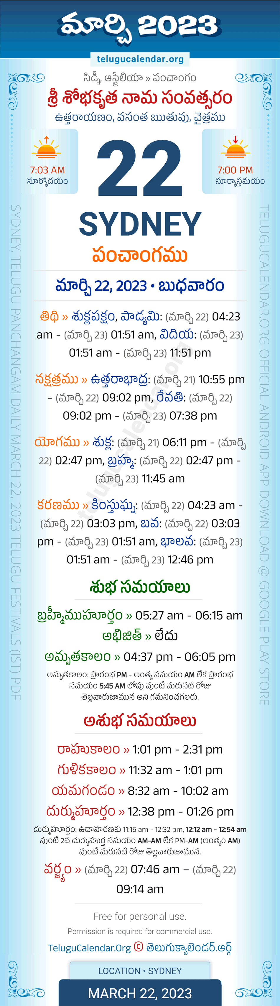 Download » March 22, 2023 » Sydney (Australia) Telugu Panchangam Daily Sheet with Auspicious and Inauspicious Timings.