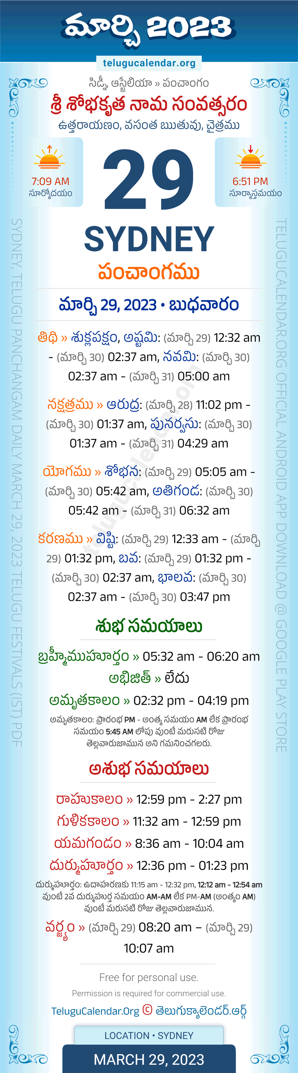Download » March 29, 2023 » Sydney (Australia) Telugu Panchangam Daily Sheet with Auspicious and Inauspicious Timings.