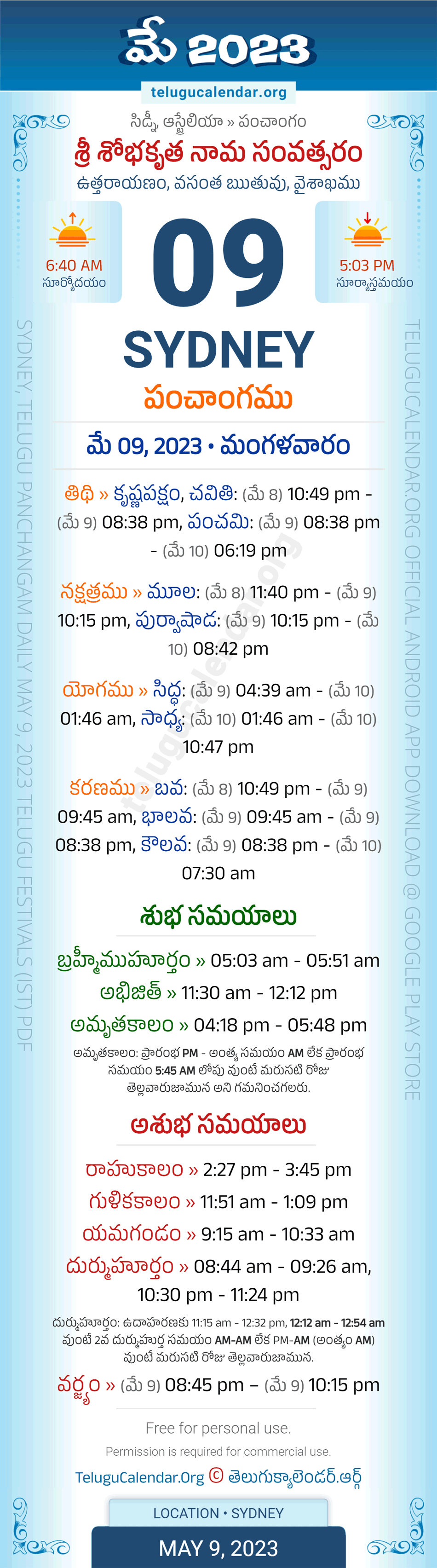 Download » May 9, 2023 » Sydney (Australia) Telugu Panchangam Daily Sheet with Auspicious and Inauspicious Timings.
