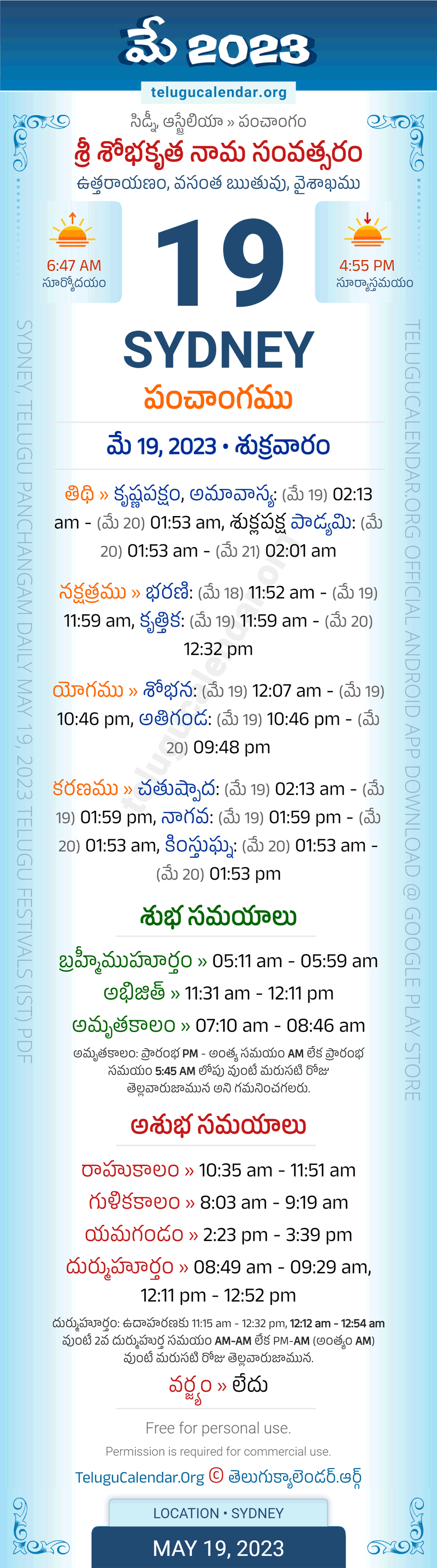 Download » May 19, 2023 » Sydney (Australia) Telugu Panchangam Daily Sheet with Auspicious and Inauspicious Timings.