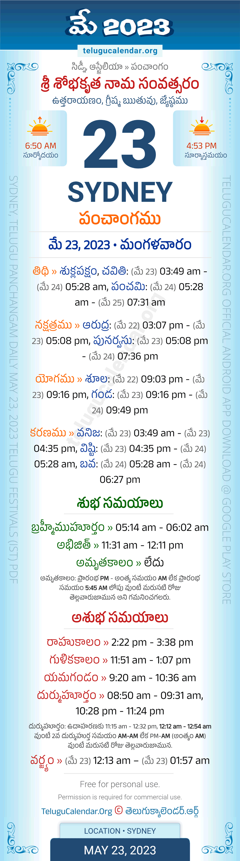 Sydney Panchangam May 23, 2023 Daily Sheet in Telugu... Sydney Telugu Panchangam Tuesday, May 23, 2023, Today's Sydney Tithi: Sukla Paksham, Chavithi: (May 23) 03:49 am - (May 24) 05:28 am, Panchami: (May 24) 05:28 am - (May 25) 07:31 am, Today's Sydney Nakshatram: Arudra: (May 22) 03:07 pm - (May 23) 05:08 pm, Punarvasu: (May 23) 05:08 pm - (May 24) 07:36 pm, Telugu Year: Sri Sobhakritu Nama Samvatsaram, Vedic Aayana: Uttarayanam, Vedic Rutuvu: Grishma, Chandramasa (Amanta): Jyeshtamu. Below image showing information about the 5 attributes of the day, viz., Varam, Tithi, Nakshatram, Yogam & Karanam along with starting and end timings. Read more